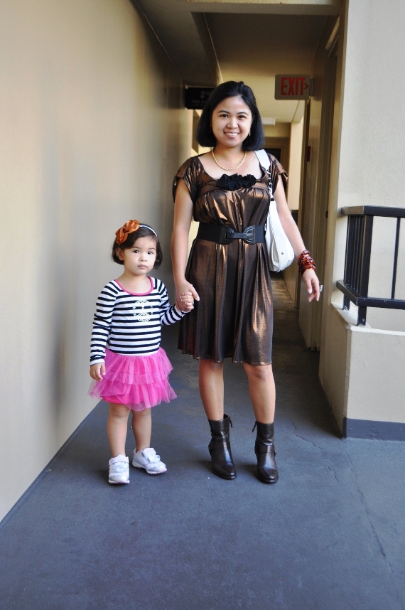 Awww your daughter is such a fashionista! So cute! And I love the metallic color of your dress!
